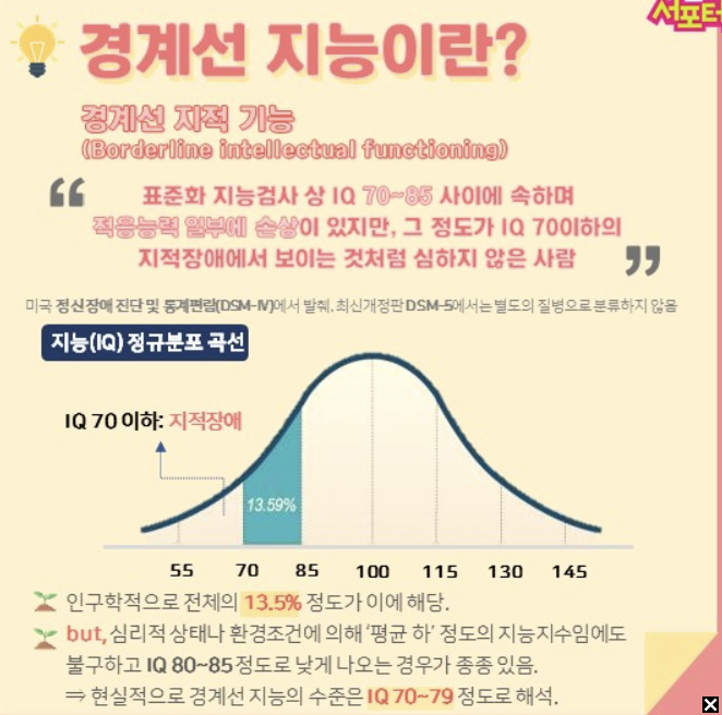 웩슬러 지능검사 기준으로 지능지수가 70~79점이거나 DSM 기준 71~84점으로 지적장애인과 비 지적장애인 사이의 경계선으로 분류되는 상태이지만 법적으로 장애인 등록이 절대 불가능하기 때문에 대한민국 사회에서는 명백한 비장애인으로 간주됩니다. 그렇기에 미등록 자폐인과 비슷하게 복지의 사각지대에 놓여있습니다.