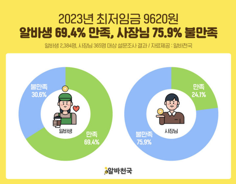 구인구직 아르바이트 전문 포털'알바천국'에서 자사 개인회원 4518명과 기업회원 365명을 대상으로 2023년도 최저임금 만족도를 조사해 결과를 공개했습니다. 현재 알바 중이라고 답한 응답자 2384명 중 69.4%는 '만족'하지만, 사장 75.9%는 '불만족'하는 것으로 나타났습니다. 특히 사장의 경우 절반 가까운 47.1%가'매우 불만족'이라고 답했습니다.
