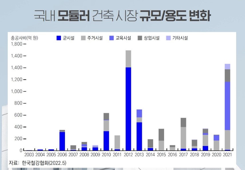 대한건성정책연구원은 한국의 모듈러 주택 건축 시장 규모는 오는 2015년 3,800~7500억 원, 2020년에는 1조 원이 상으로 커질 것으로 전망하기도 했습니다. 이에 따라 모듈러 주택 시장을 선점하기 위한 건설사들의 움직임도 빨라지고 있습니다.