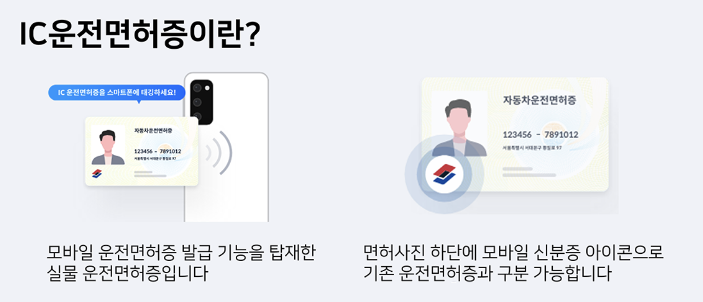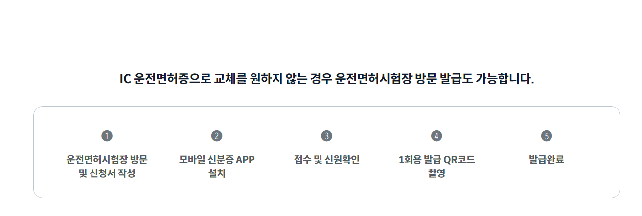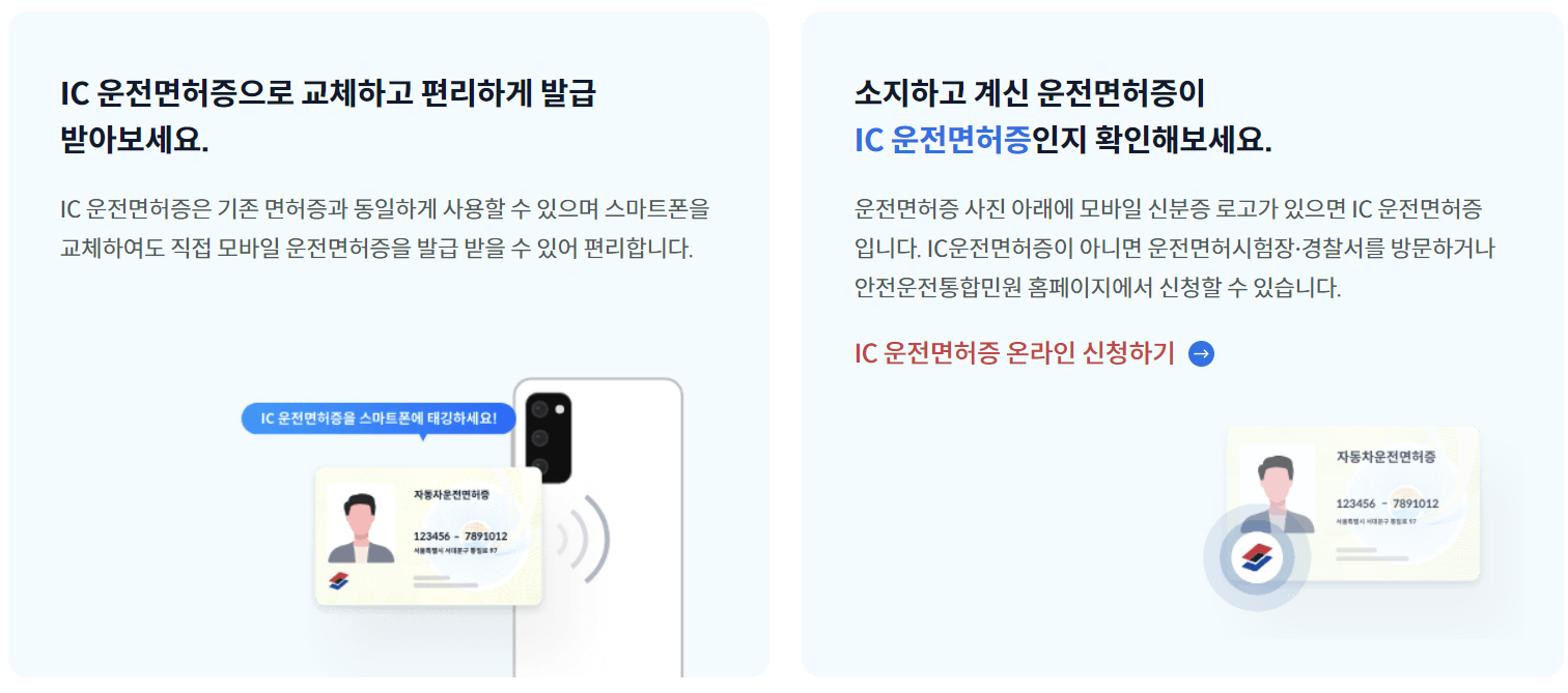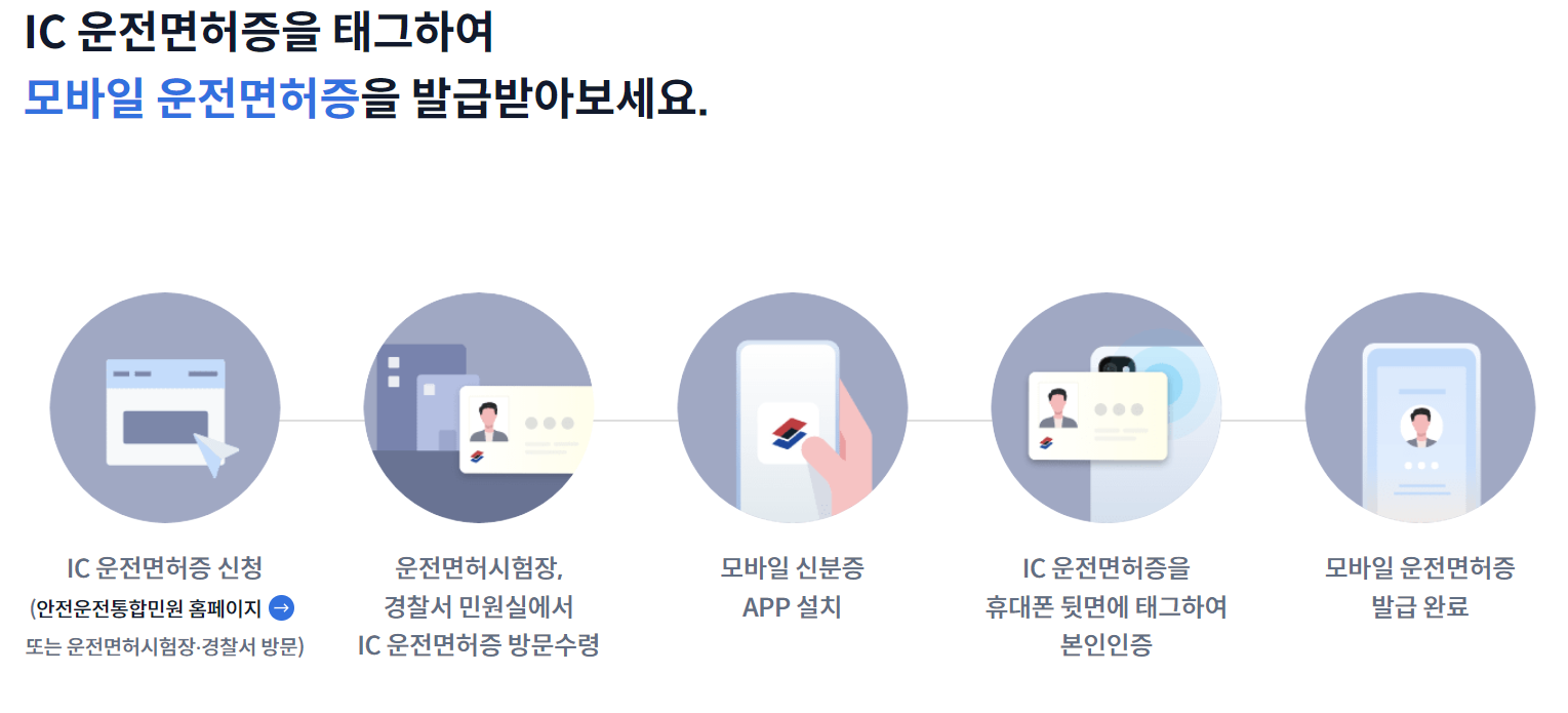 | 1. IC 운전면허증 신청(안전운전통합민원 홈페이지 또는 운전면허시험장,경찰서 방문) 2. 운전면허시험장, 경찰서 민원실에서 IC 운전면허증 방문수령 3. 모바일 신분증 APP 설치 4. IC 운전면허증을 휴대폰 뒷면에 태그하여 본인인증 5. 모바일 운전면허증 발급 완료 |