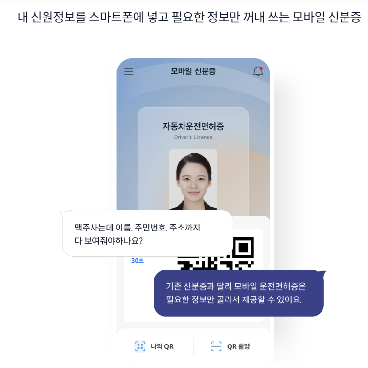 개념(자기 정보 결정권 강화) : 개인이 스마트폰 안에 자신의 정보를 보유하고 직접 꺼내 쓰며, 신원증명을 위해 필요한 정보만 골라서 제공할 수 있습니다.