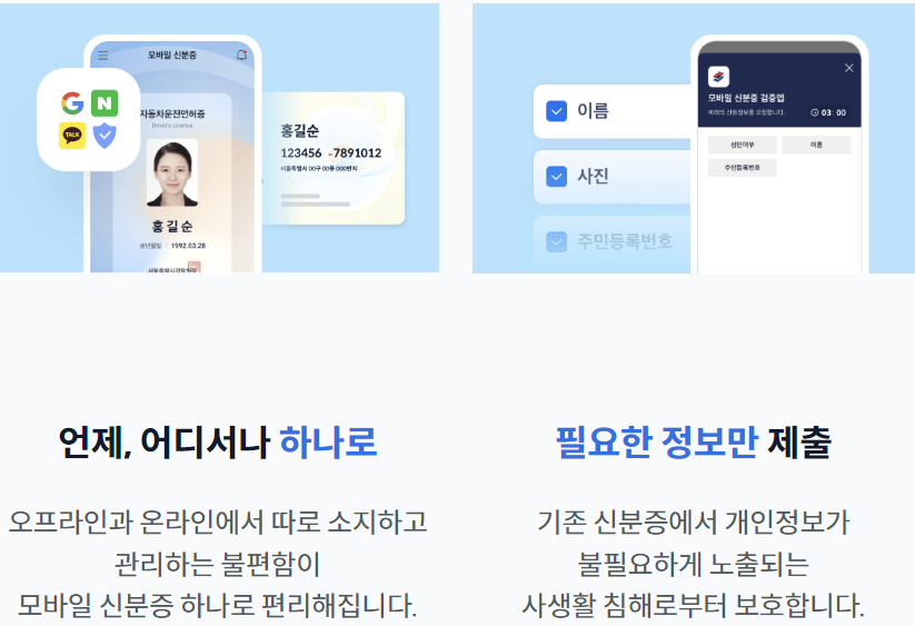 활용(온·오프라인 통합) : 모바일 신분증 하나로 오프라인과 온라인에서 간편하고 안전하게 사용할 수 있습니다.