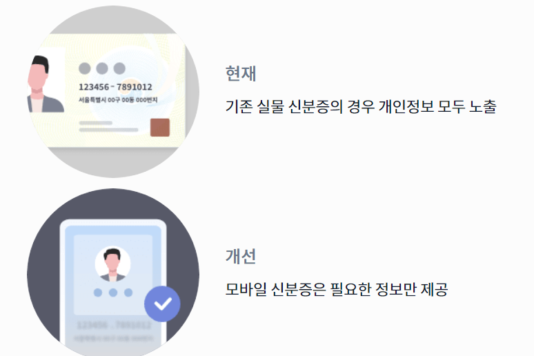 오프라인과 온라인에서 따로 소지하고 관리하는 불편함이 모바일 신분증 하나로 편리해집니다. 기존 신분증에서 개인정보가 불필요하게 노출되는 사생활 침해로부터 보호합니다.