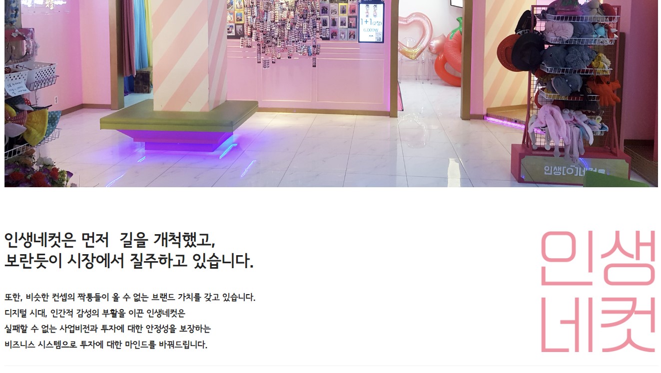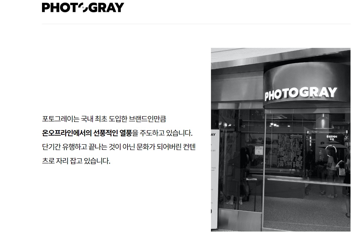 | 인생네컷 | 1. 2017년 대구 동성로에 첫 포토 부스로 시작함. 2. '인생네컷'이라는 단어를 유행시킴. 3. 무인사진관 열풍을 재유행시킨 브랜드로 평가 |