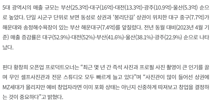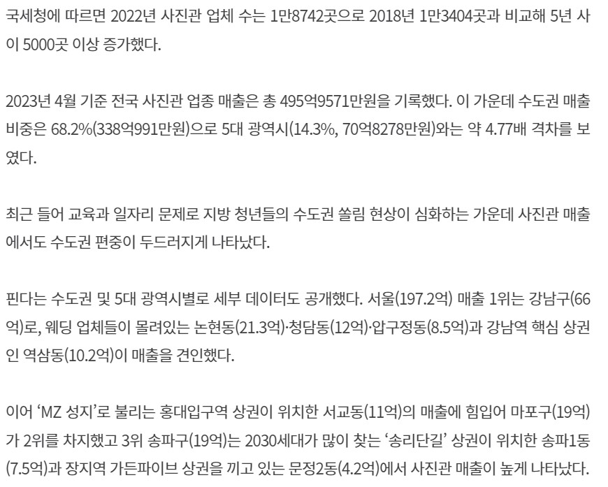 국세청에 따르면 2022년 사진관 업체 수는 1만 8742곳으로 2018년 1만 3404곳과 비교해 5년 사이 5000곳 이상이 증가했습니다. 최근 들어 교육과 일자리 문제로 지방 청년들의 수도권 쏠림 현상이 심화하는 가운데 사진관 매출에서도 수도권 편중이 두드러지게 나타났습니다.