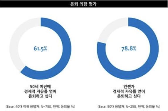 경기가 호황일 무렵 2030대 사이에서 부동산 및 '주식', '코인' 등에 영끌 투자 역시 파이어 족들이 빠른 시간 내 은퇴자금을 모으려는 움직임으로 볼 수 있습니다. 이러한 니즈는 경기 불황인 현재에도 지속되고 있고, 엠브레인 트렌드모니터가 전국 19~59세 급여소득자 성인남녀 1,000명을 대상으로 '직장생활 평가 및 F.I.R.E족 관련 인식 조사'를 실시한 결과 경제적 자유를 얻어 이른 시기에 은퇴를 원하는 직장인들이 늘어나고 있는 것으로 나타났습니다. 전체 응답자 10명 중 8명(81.3%)이 일하지 않아도 생활에 지장이 없는 '경제적 자유'에 대한 니즈를 높게 평기한 가운데, F.I.R.E족에 대한 인지도가 이전보다 소폭 증가(24.7%), 2021→47.3%, 2022→52.3% 했습니다. 20~40대 응답자의 61.5%가 50세 이전 은퇴 의향을 내비쳤으며, 이미 F.I.R.E족의 기준을 넘어선 50대의 경우에도 언젠가 경제적 자유를 얻어 은퇴를 하고 싶다고 말했습니다.