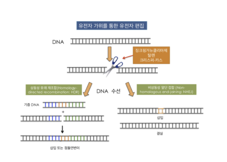 ※유전자 가위를 통한 유전자 편집 모식도. 유전자 가위로 잘린 DNA는 상동성 유래 재조합 혹은 비상동성 말단 접합의 방식을 통행 수선되며, 그 과정에서 유전적 변이가 도입됩니다.