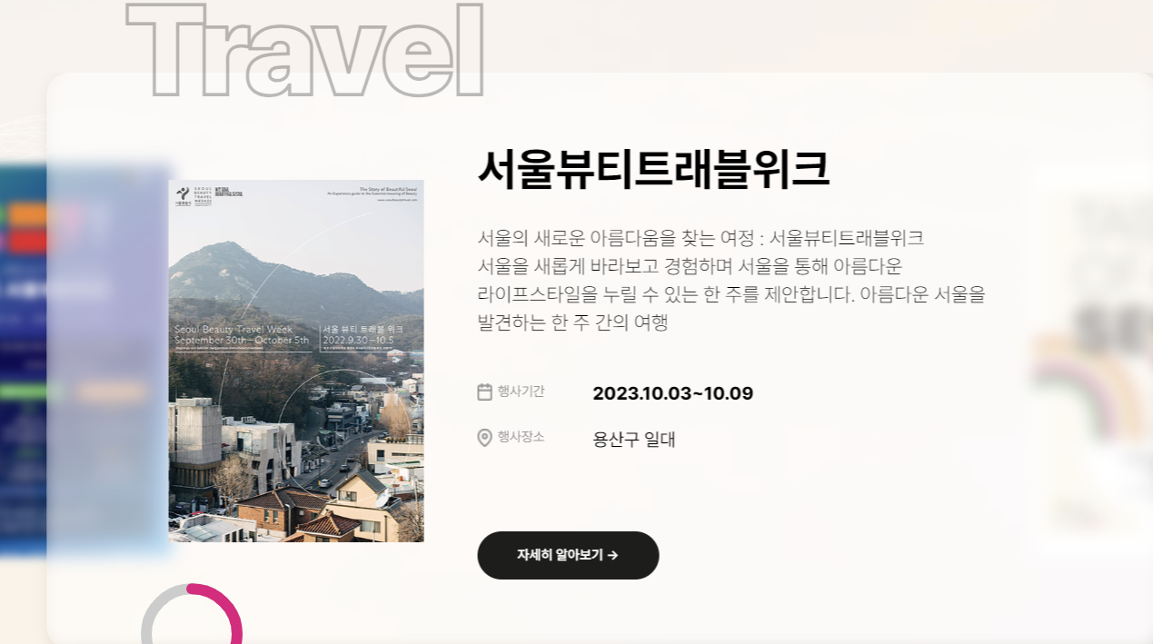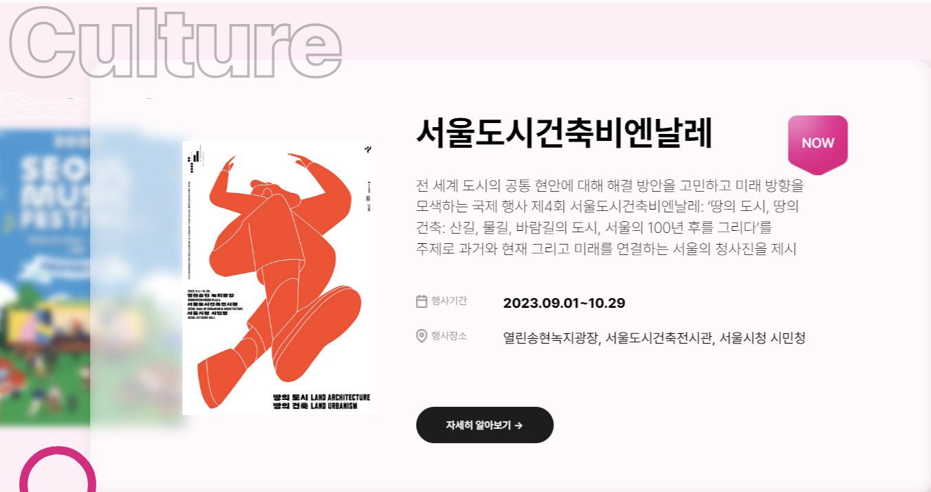 9월도 벌써 보름이나 지났습니다. 바람만 살랑 불어도 밖으로 나가고 싶은 계절 가을입니다. 긴 추석 연휴 때 까지도 여유롭게 연휴를 못 즐기는 분들도 많을 거라 생각합니다. 연휴가 지나고 나서야 시간적인 여유가 되시는 분들께 추천드립니다. '내 손안에 서울' 10월 서울에서 즐길 수 있는 축제 문화공간이 있는 곳들을 소개해드리겠습니다.