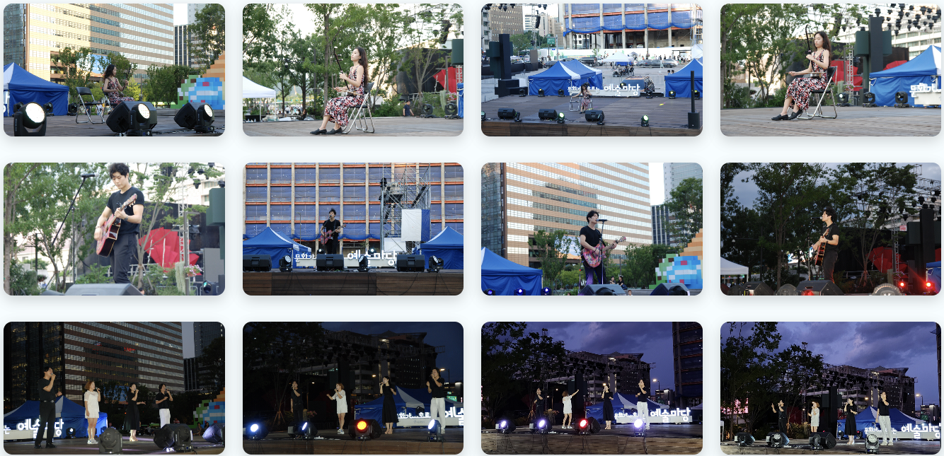 시민들의 일상 속 문화 향유 기회를 제공하는 <문화가 흐르는 예술마당>이 4월부터 11월까지 약 8개 얼 간 광화문광장, 노들섬 잔디마달에서 진행됩니다. 평일은 도심 속에서 즐길 수 있게 광화문에서, 주말은 아름다운 자연과 함께할 수 있게 노들섬에서 다양한 장르의 공연들이 매월 진행 될 예정입니다.
