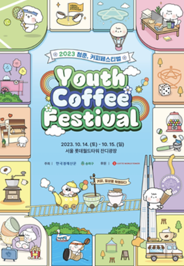 | 개요 : 축제 > 가을먹거리축제 기간 2023.10.14. (토) ~ 2023.10.15. (일) 시간 : 13:00 ~ 19:00 장소 : 서울 롯데월드타워 잔디광장 요금 : 무료 정보 : https://youthcoffee.co.kr/ 관련 : 축제 달력 |