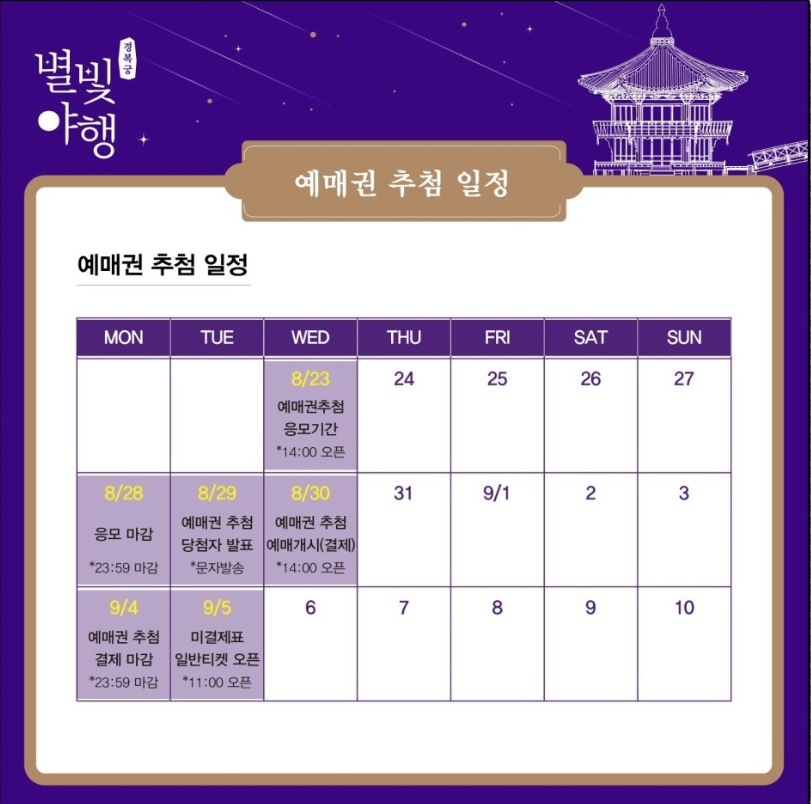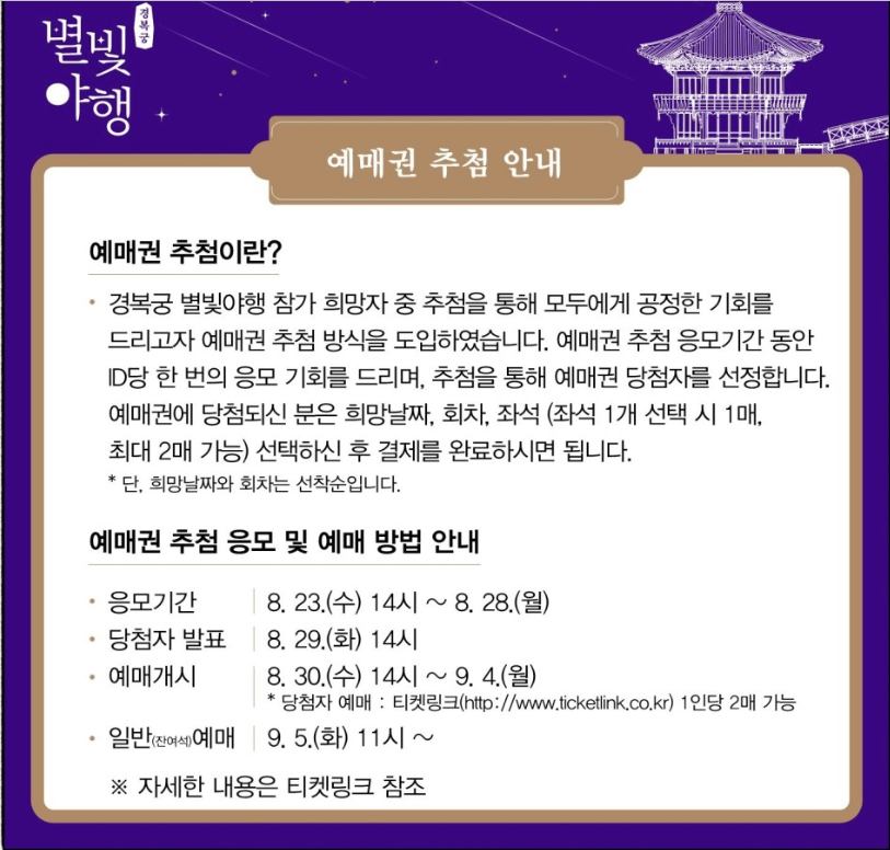 *경복궁 별 빛 야행 참가 희망자 중 추첨을 통해 모두에게 공정한 기회를 드리고자 예매권 추첨 방식을 도입하였습니다. 예매권 추첨 응모기간 동안 ID당 한 번의 응모 기회를 드리며, 추첨을 통해 예매권 당첨자를 선정합니다. 예매권에 당첨되신 분은 희망날짜, 회차, 좌석 (좌석 1개 선택 시 1매, 최대 2매 가능)